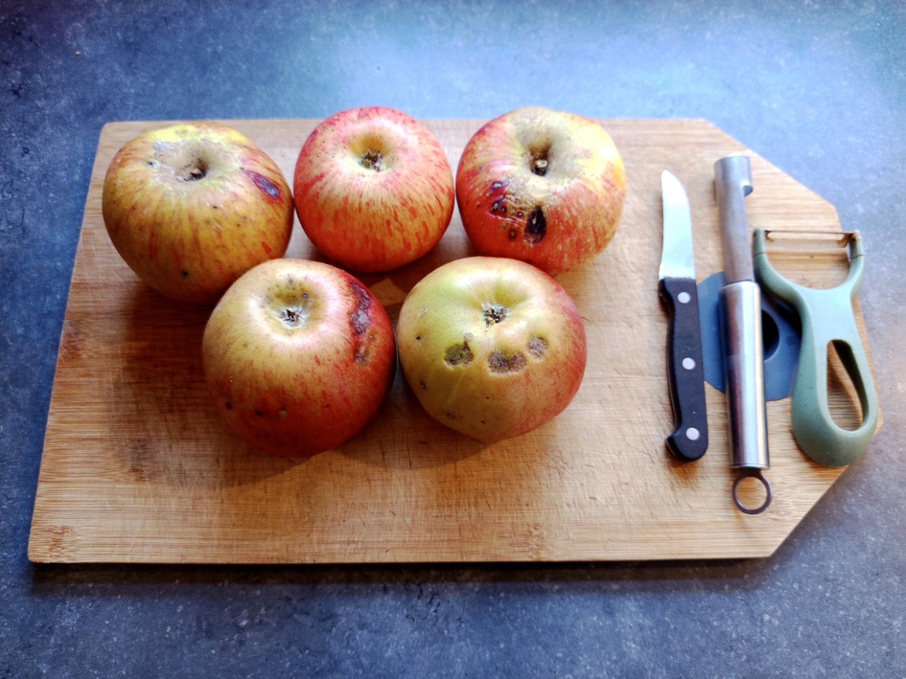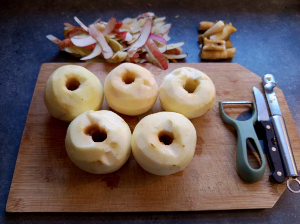 Kies 5 mooie grote kookappels, verwijder het klokhuis en de schil en maak hier eventueel appelazijn van.