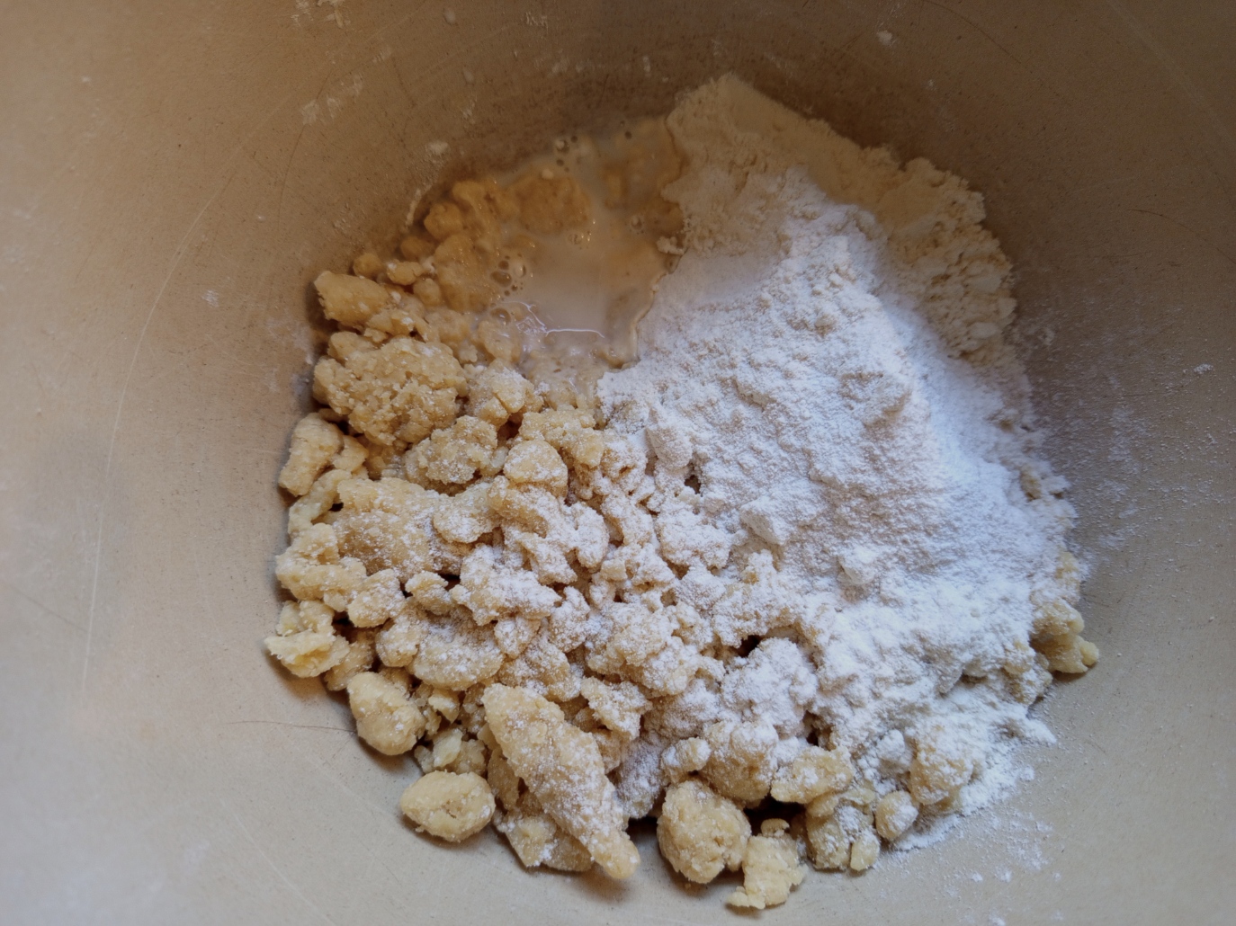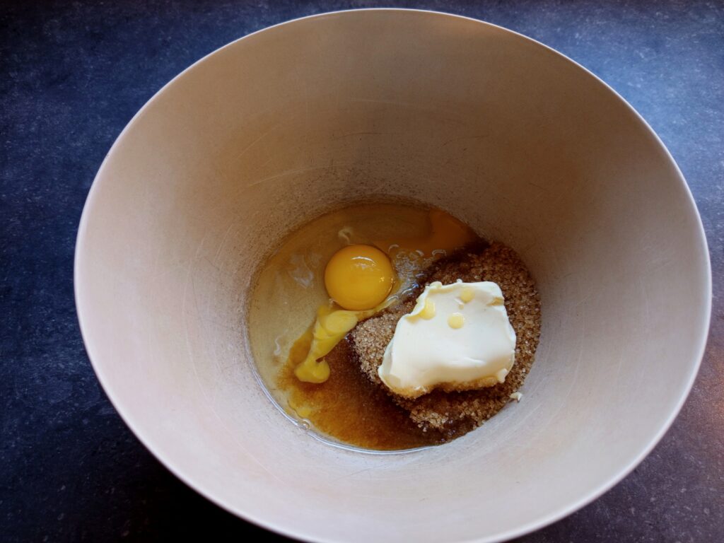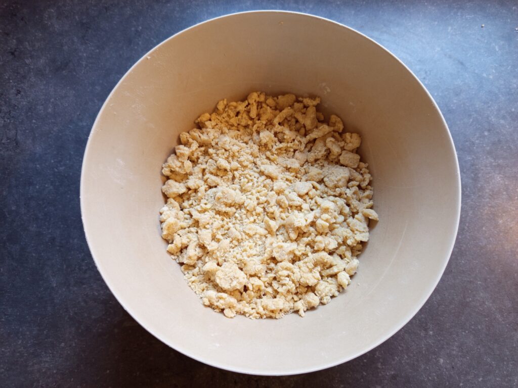 Mix 2 eieren 60g boter 100g rietsuiker (of kristalsuiker) en 350g bloem (wit of volkoren). Wrijf door de handen, zodat er kruimels ontstaan, dus geen glad deeg proberen te vormen.