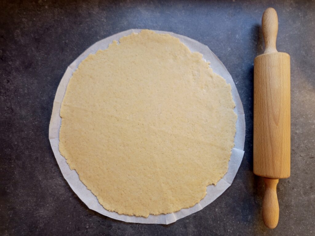 Rol de bal met een deegroller uit over het ronde bakpapier. Doe de bodem in de springvorm en vul met de appelvulling.