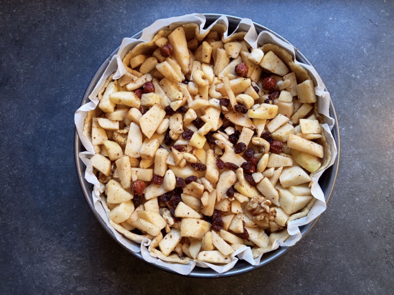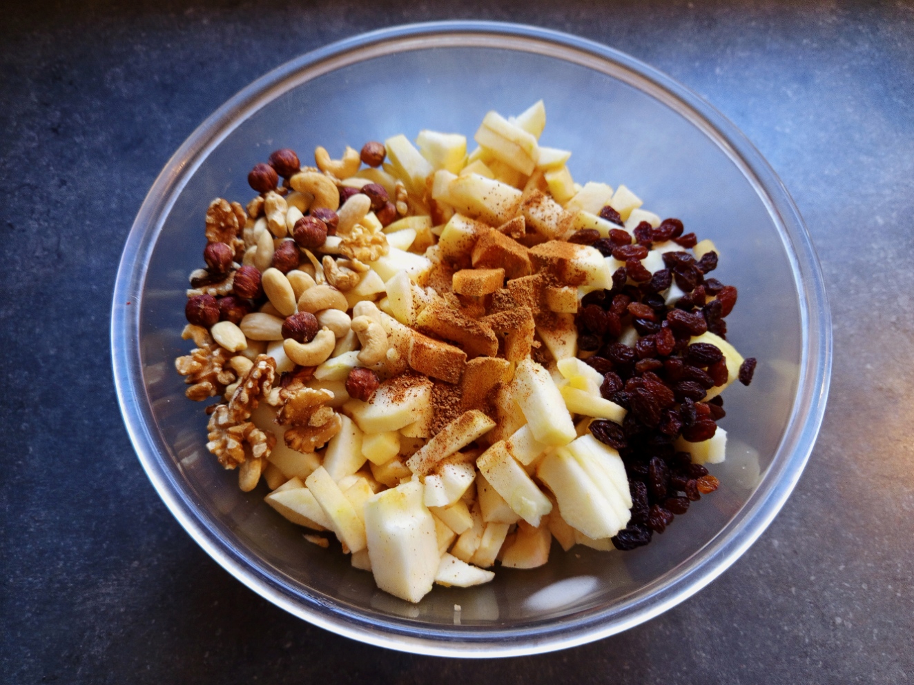 Snij de appels in stukjes en voeg 100g gemengde noten 50g rozijnen en kaneel toe.