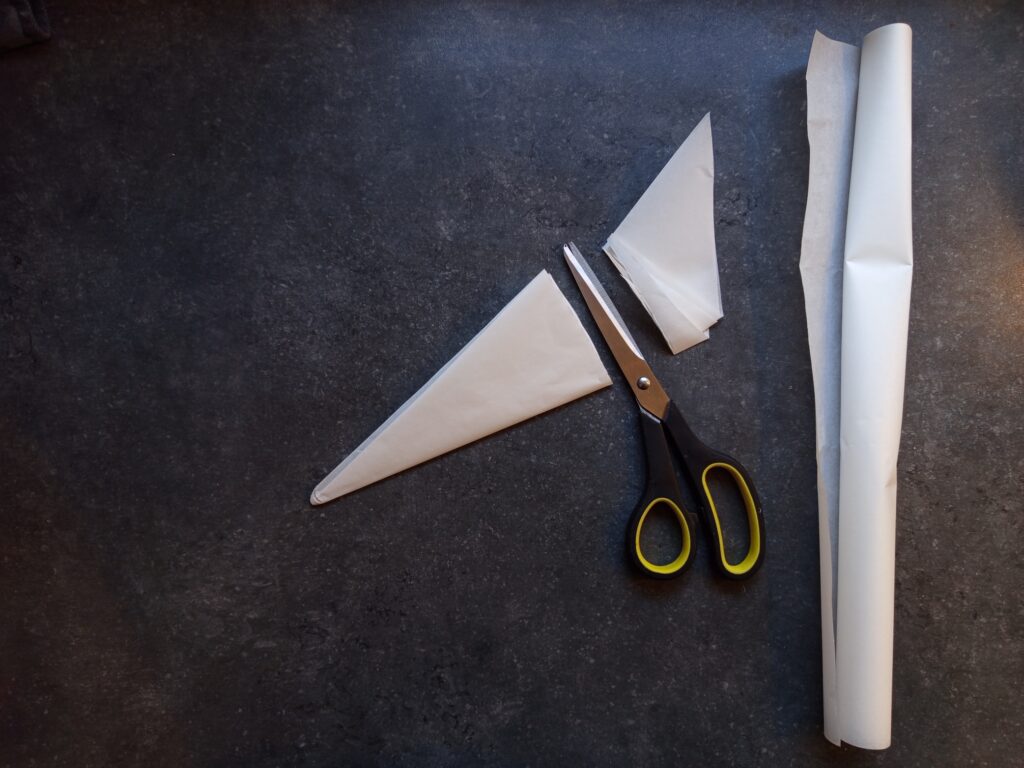 Vouw een vierkant stuk bakpapier, knip de rand eraf en er ontstaat een cirkel