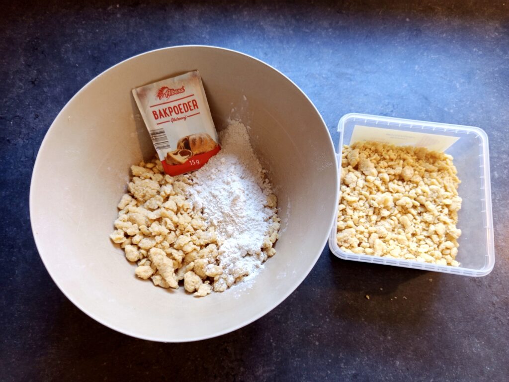 Verdeel de kruimels in twee delen. Weeg 350g kruimels af om later te gebruiken (bedekken met kruimels). Met de rest van de kruimels wordt het deeg voor de bodem gemaakt. Voeg 50g meel toe, een beetje bakpoeder en twee scheutjes melk, zodat het kneedbaar wordt. Kneed 2 minuten en maak er een bal van.