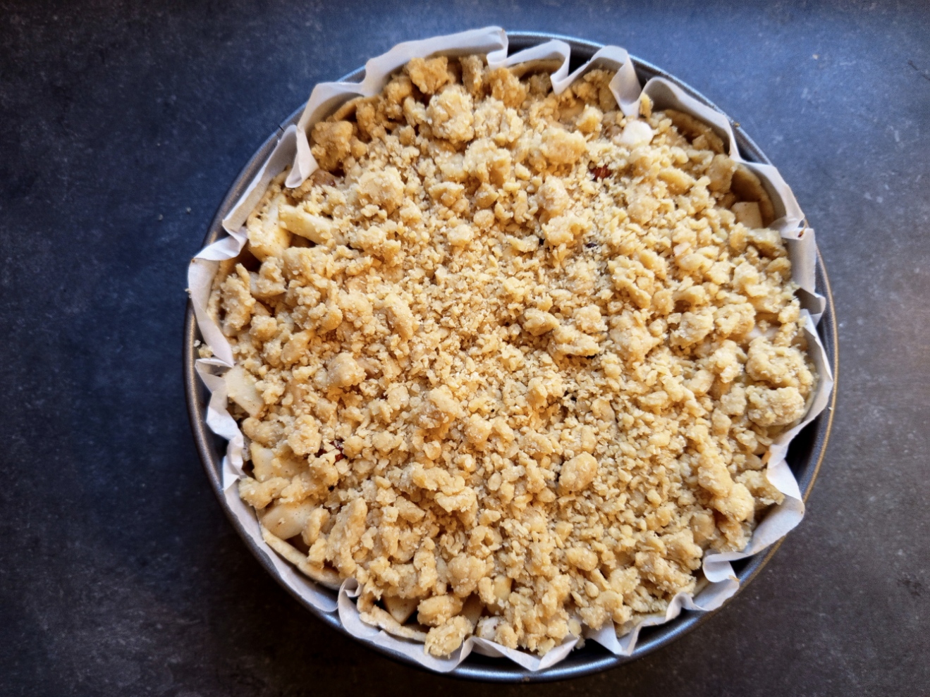 Bak de appelkruimeltaart in 35-40 minuten gaar in een voorverwarmde heteluchtoven op 180 graden.