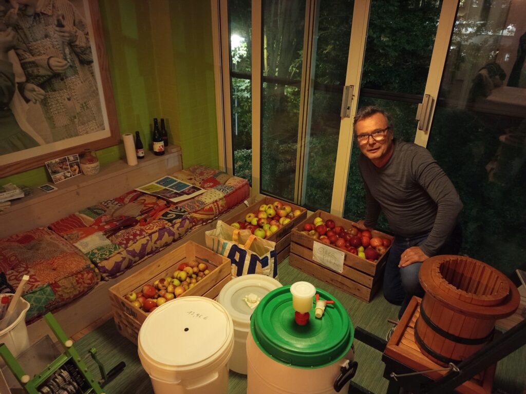 Mart en Marc hebben 's avonds doorgewerkt met het crushen totdat de laatste appels, inclusief die van de ciderappel-batch, verwerkt waren. Vervolgens moest er nog worden opgeruimd. Het was een arbeidsintensieve taak en een geschikte werkruimte zou wenselijker zijn geweest dan het krappe, met zeil bedekte balkon. Het viel opnieuw op dat de crusher relatief grove stukken appel produceert. De vraag blijft of het pecto-enzym in staat zal zijn om dit materiaal volledig tot pulp om te zetten. De resultaten zullen dit moeten uitwijzen.