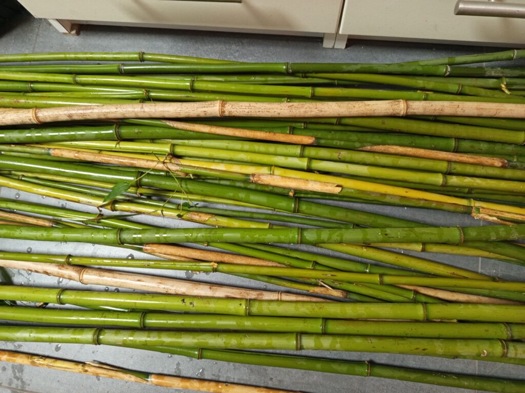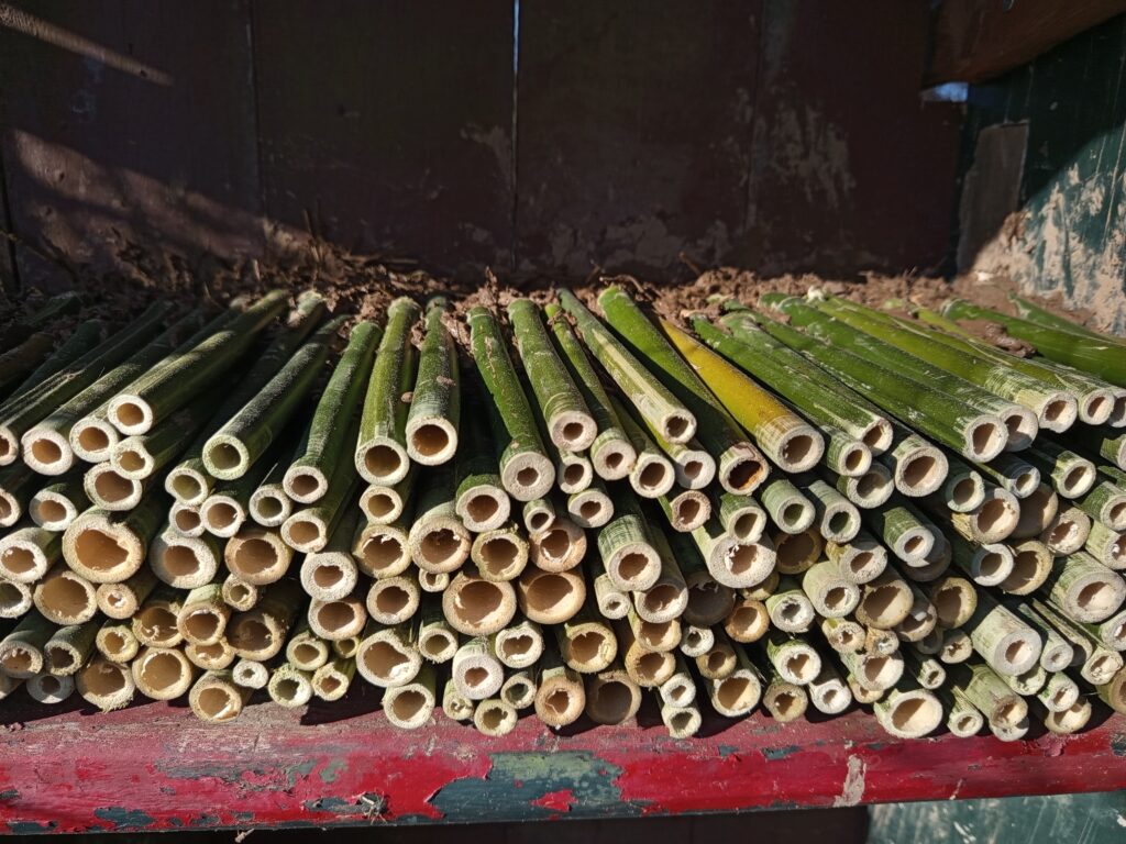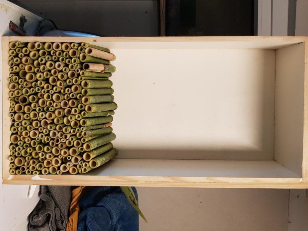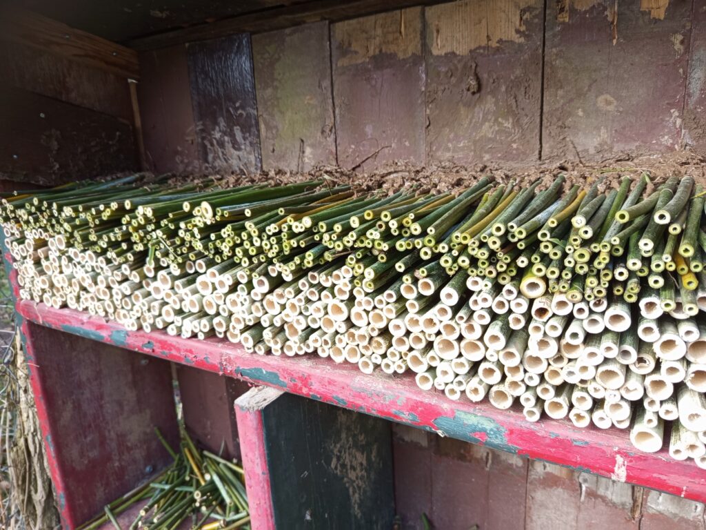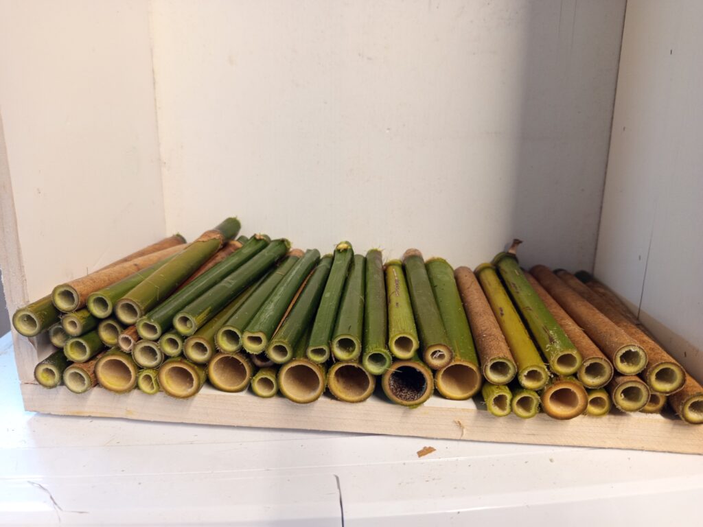 Dunne bamboestengels zijn ideaal voor kleine bijen. De dikkere varianten, met een diameter groter dan 1 cm, dienen vaak als overnachtingsplek voor de moederbij, dicht bij haar nest. De dunne stengels kunnen eenvoudig met een snoeischaar op maat worden geknipt zonder dat ze splijten. Voor de dikkere bamboe is een zaag noodzakelijk; bij gebruik van een snoeischaar zal de stengel namelijk wel splijten.