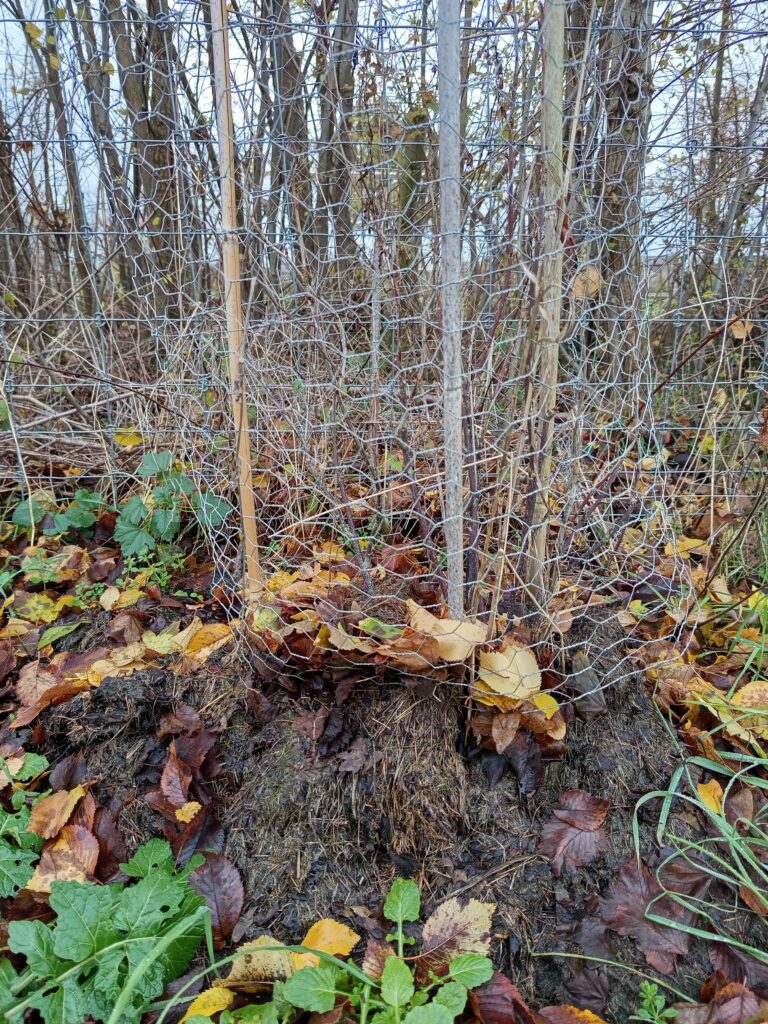 Het dode gras is tegen de basis geplaatst.Deze bleef ook vochtig en is gaan rotten. De basis is tevens aangevreten door reeën. Vermoedelijk gaat deze bessenstruik dood of groeit maar heel langzaam.