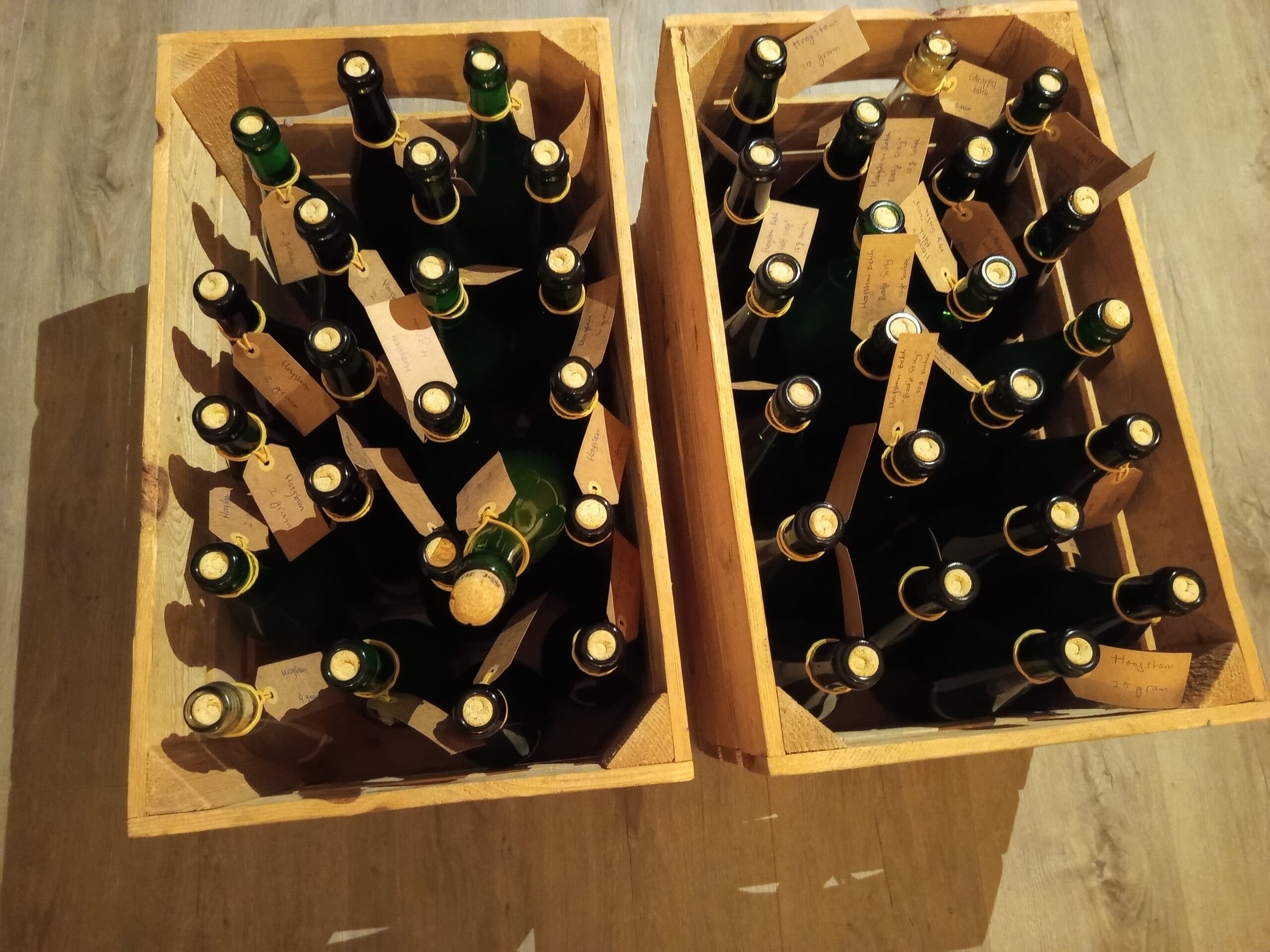 De opbrengst was 37 flessen van 750ml: 10 flessen met 2 gram suiker, 10 flessen met 4 gram suiker, 5 flessen met 10 gram suiker, 5 flessen met 15 gram suiker en 5 flessen met 25 gram suiker. Plus 1 doorzichtige controlefles voor de kleur.