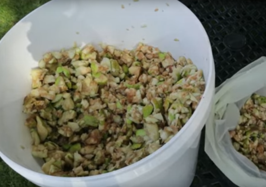 De meest gangbare manier van cider maken is het cruchen en meteen persen van sap en dit vervolgens vergisten. Wij willen echter meer smaak en sap uit de pulp en schil. Dit op aanraden van expert John Waelpoel: Appels ontsmetten en crushen, dan een pecto-behandeling, gevold door de eerste vergisting en dan pas persen.