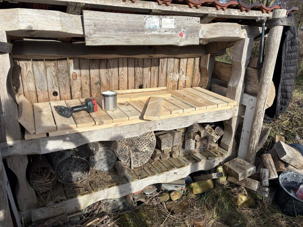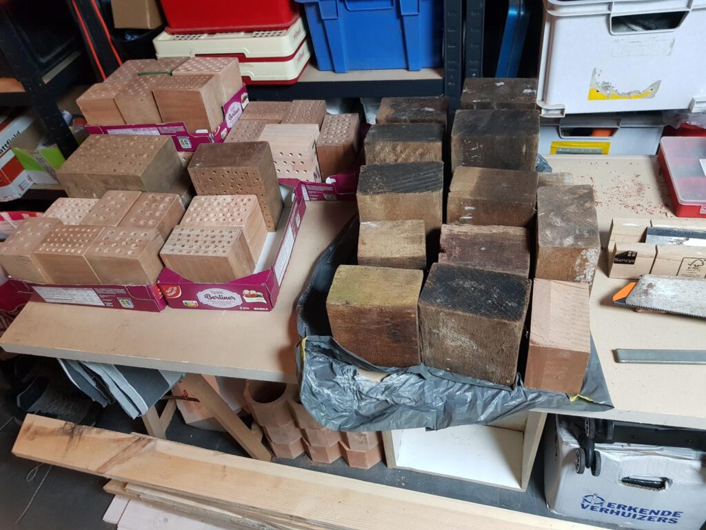 Bekijk...In het kader van groot onderhoud zijn de draagplanken van het bijenhotel in Limbricht vervangen. Ron heeft, met assistentie van Irma, deze planken vernieuwd. Ten behoeve van het behoud van de aanwezige bijen in oude houtblokken zijn de oude nestblokken met bezette nestgangen zorgvuldig onder het hotel gepositioneerd. Hierdoor krijgen de overwinterende bijen de kans om nog op natuurlijke wijze uit te vliegen en de nieuwe nestplaatsen te gaan gebruiken.